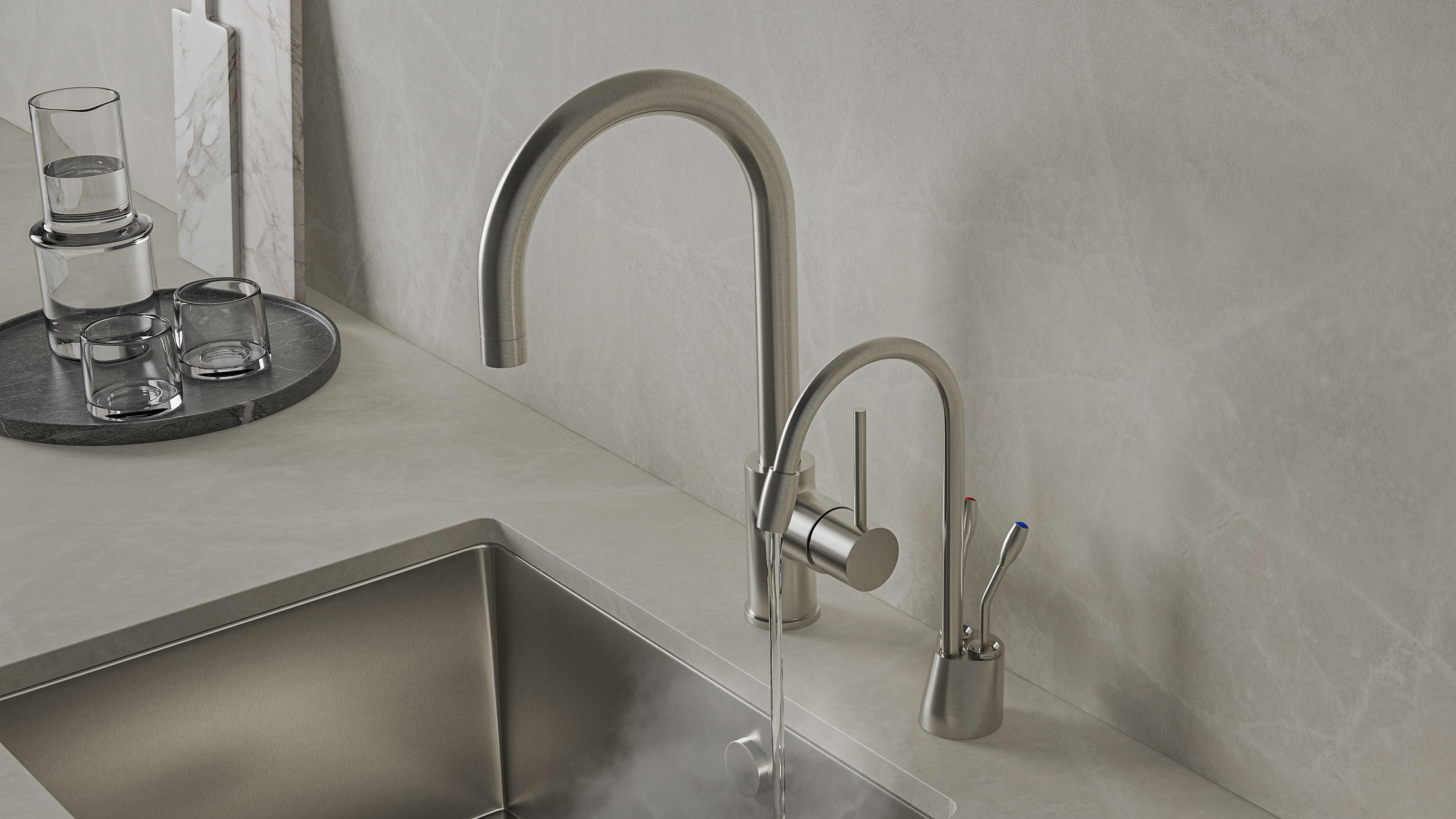 Тип смесителя2 в 1 (фильтрованная вода + кипяток)Материал смесителяВысококачественная латуньЦветнержавеющая стальНапряжение питания220-240 ВПлавная регулировка температуры водыот 45 до 98 СГарантия2 года