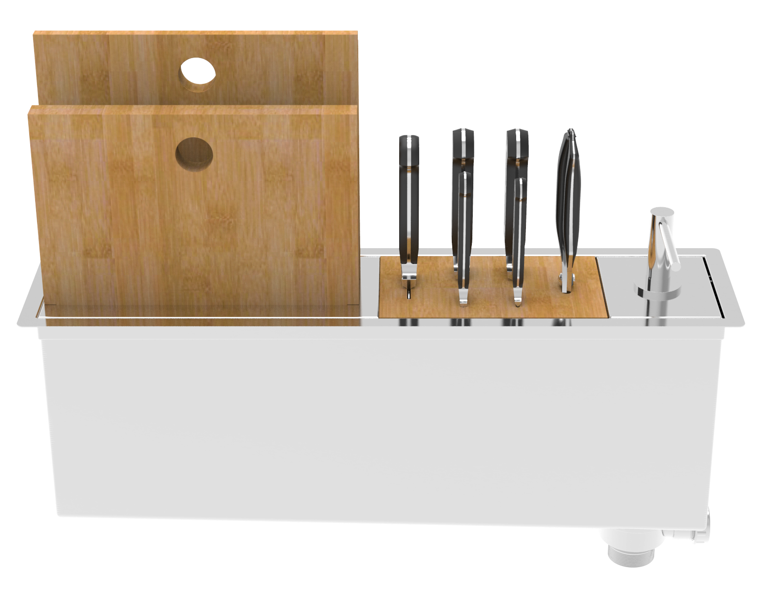 Блок системы комплектуется набором сливной фурнитуры и крепежной арматуры. В блок можно установить несколько модулей из 10 вариантов разного функционала, которые можно менять местами. Модули выполнены из брашированной нержавеющей стали и из высококачественной древесины бамбука.