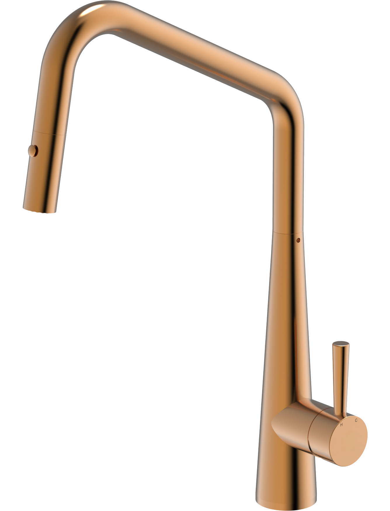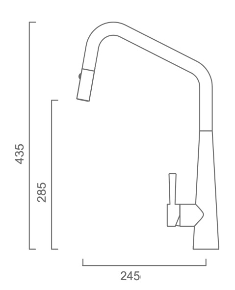 Смеситель имеет один рычаг управления, поворотный излив и выдвижную лейку с двойным переключением «струя/душ».