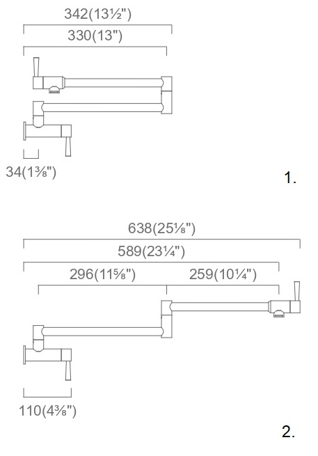 Особенностью Pot Filler является то, что он имеет шарнирные соединения, позволяющие поворачивать его, куда необходимо, дотягиваясь даже за пределы плиты. Кран над плитой используется для подачи только холодной воды. Кран крепится на стену. Его установка не составит никакого труда — в комплекте вы найдете все необходимое.- в сложенном виде: 342/330мм;